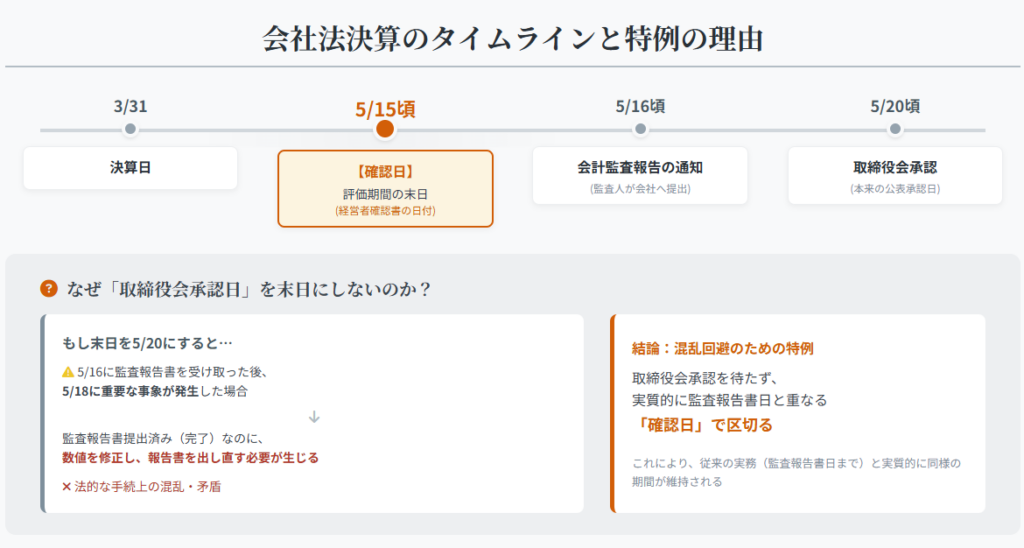 会計監査人設置会社が作成する会社法上の計算書類および連結計算書類については、実務上の混乱を避けるための特例が設けられており、評価期間の末日は「確認日」とされています(適用指針第4項)。