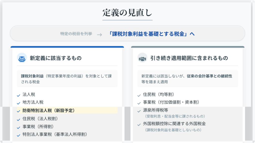 当基準案では、現行基準のような特定の税目を並べる方式から、国際会計基準との整合性も加味した「課税対象利益を基礎とする税金」という包括的な定義へと見直されました。