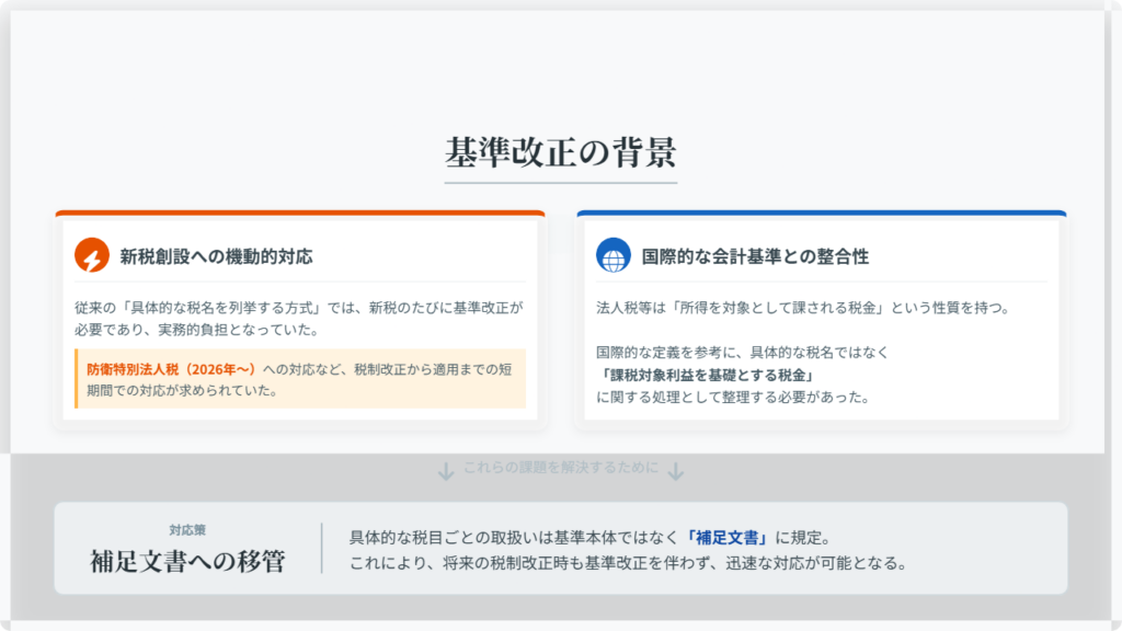 また、2026年4月1日以後に開始する事業年度から課される「防衛特別法人税」に見る税制改正への対応も後押ししています。法人税等会計基準の適用対象となる税金の定め方に従えば、現行基準に個別の定めを追加することとなり、現行の税制改正のスケジュールに鑑みると、税制改正から適用までの短期間で会計基準等の改正を行う必要がある点も懸念されていました。